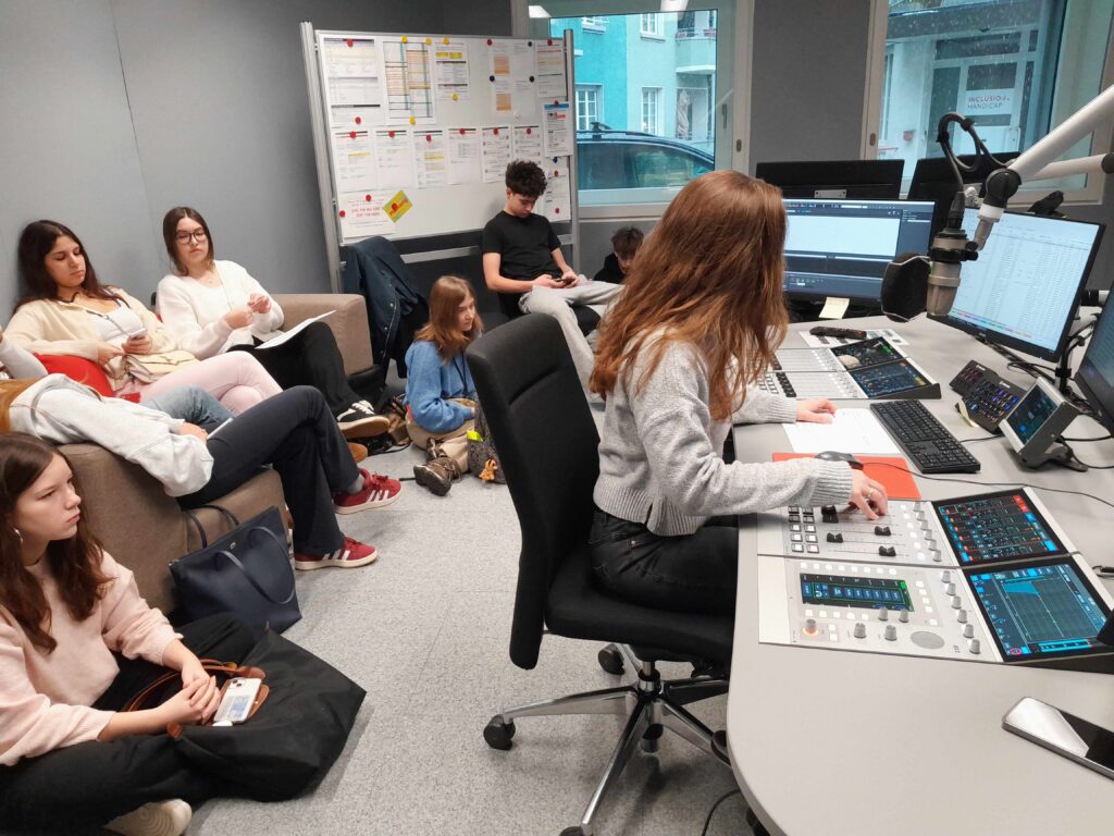 Hart auf Sendung! Die Lernenden der WR-Kurswoche im Radiostudio der SRG in Bern. (Foto: Markus Züger)